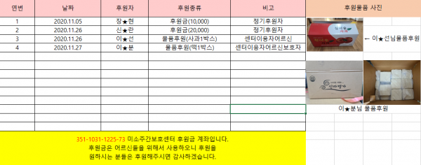 2020년 11월 미소주간보호센터 후원현황입니다.