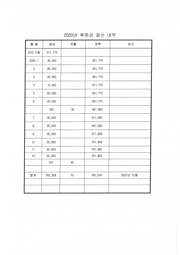 2020년도 미소주간보호센터 후원금 결산내역입니다.